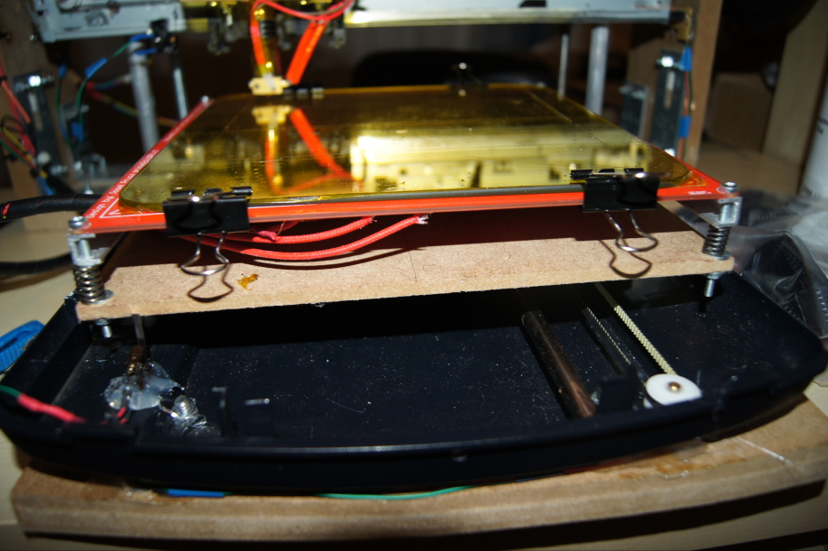 Um das Druckbett besser kalibrieren zu können habe ich die Konstruktion des Druckbetts ebenfalls leicht modifiziert. Das Druckbett ist jetzt auf Federn gelagert. Somit ist es möglich das Druckbett in seiner Höhe zu verstellen um eine gleichmäßige Ausrichtung hinzubekommen. Die richtige Kalibrierung des Druckbetts ist sehr wichtig, da es sonst passieren kann das die einzelnen Schichten nicht gleichmäßig gedruckt werden. Dies kann zum Beispiel dazu führen dass sich der Druck während des Druckens vom Druckbett löst (warping Effekt).